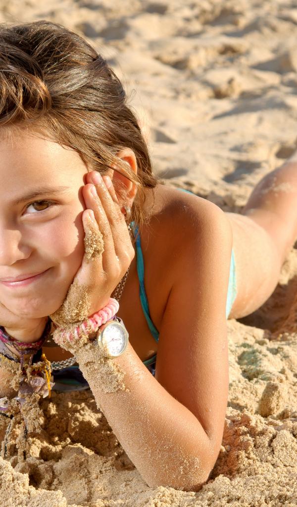 Обои Маленькая девочка лежит на песке на пляже