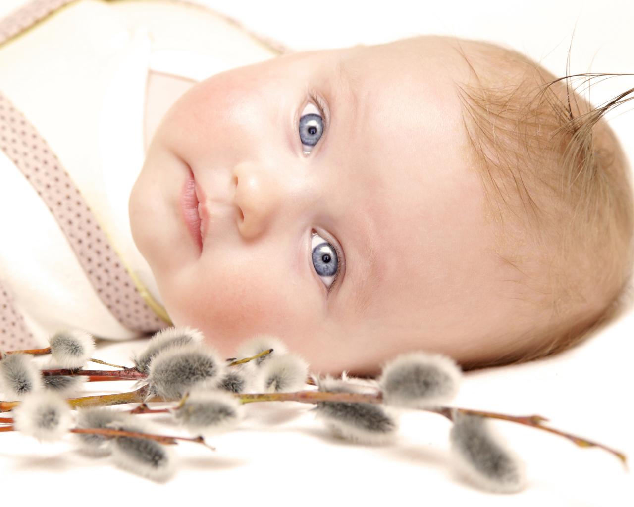 Обои Маленький голубоглазый ребенок с веткой вербы