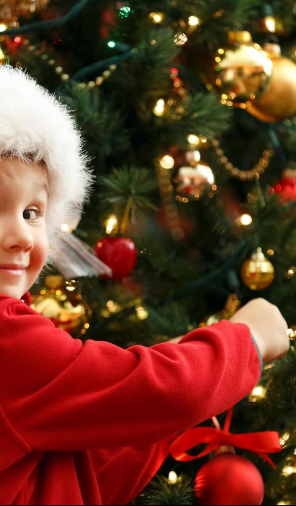 Обои Мальчик в шапке Санта Клауса наряжает елку