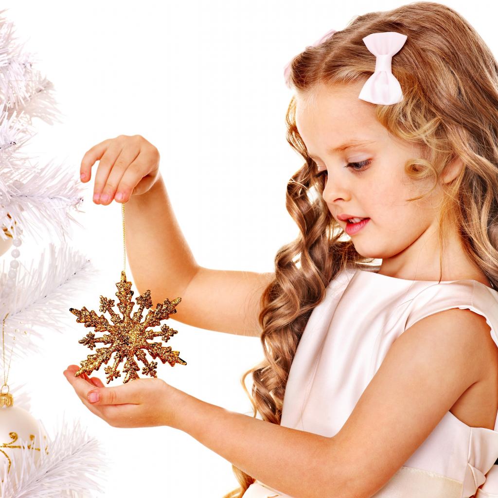 Обои Маленькая девочка держит елочную игрушку снежинку в руке