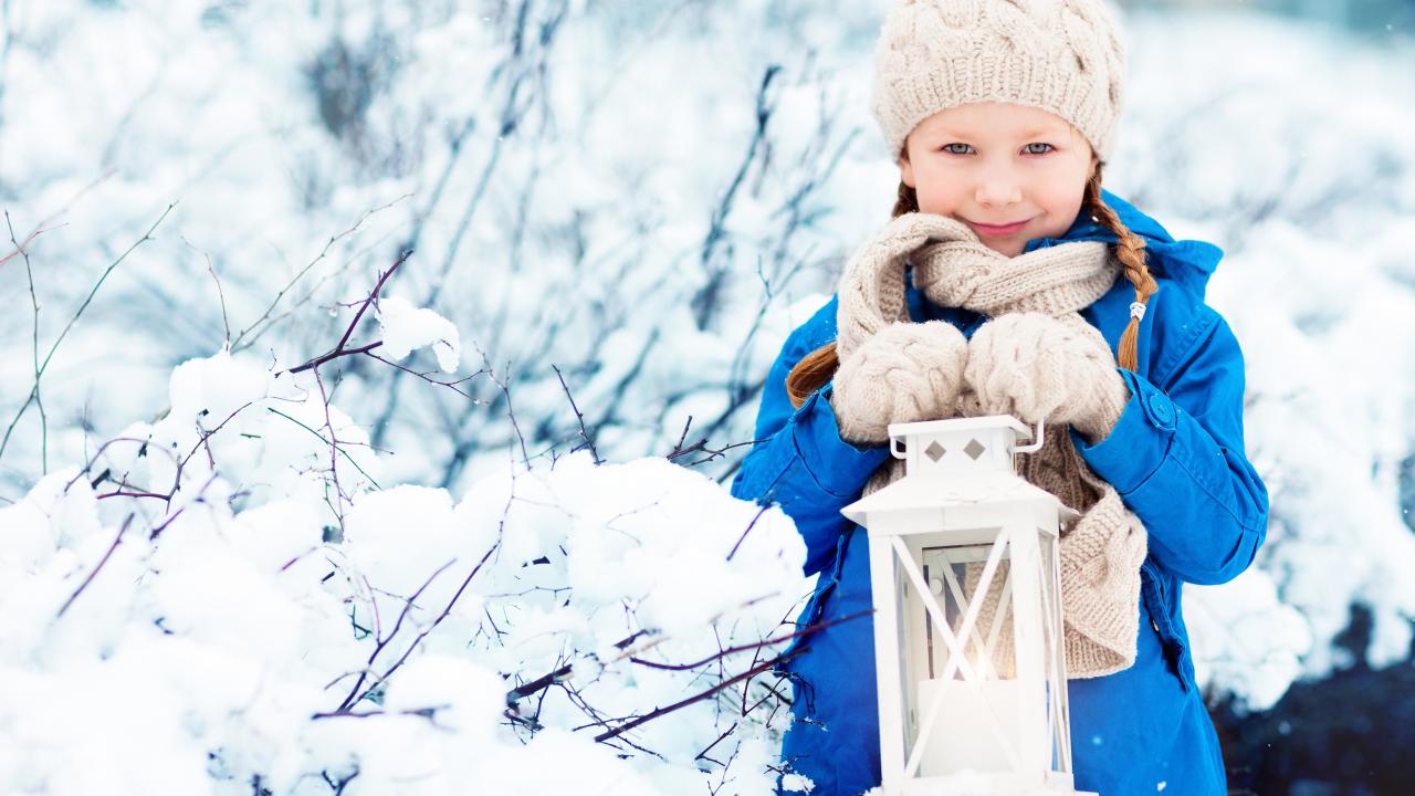 Обои Маленькая девочка с фонарем на улице зимой