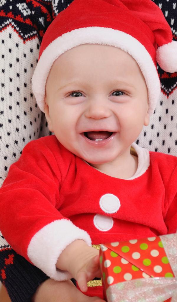 Обои Улыбающийся малыш в костюме с подарком на руках