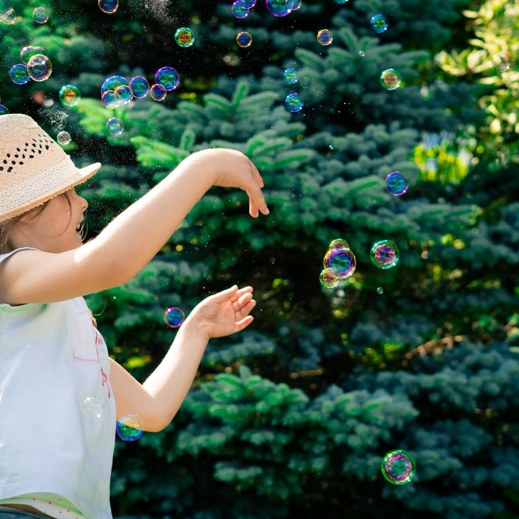 Обои Маленькая девочка с мыльными пузырями у елки