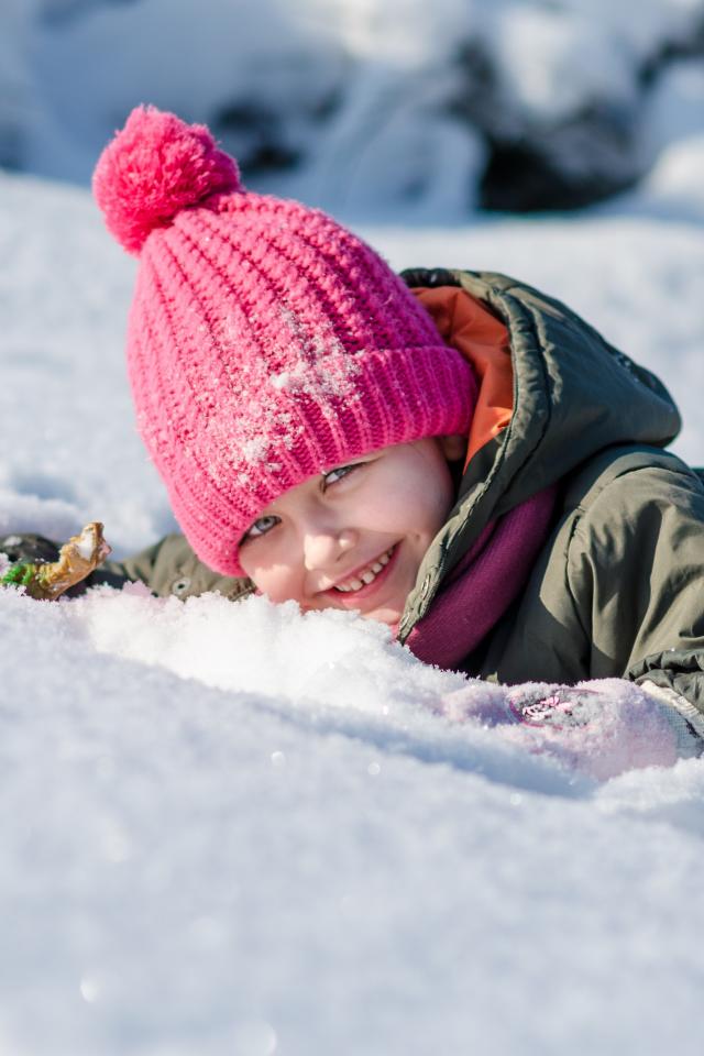 Обои Маленькая улыбающаяся девочка лежит на снегу