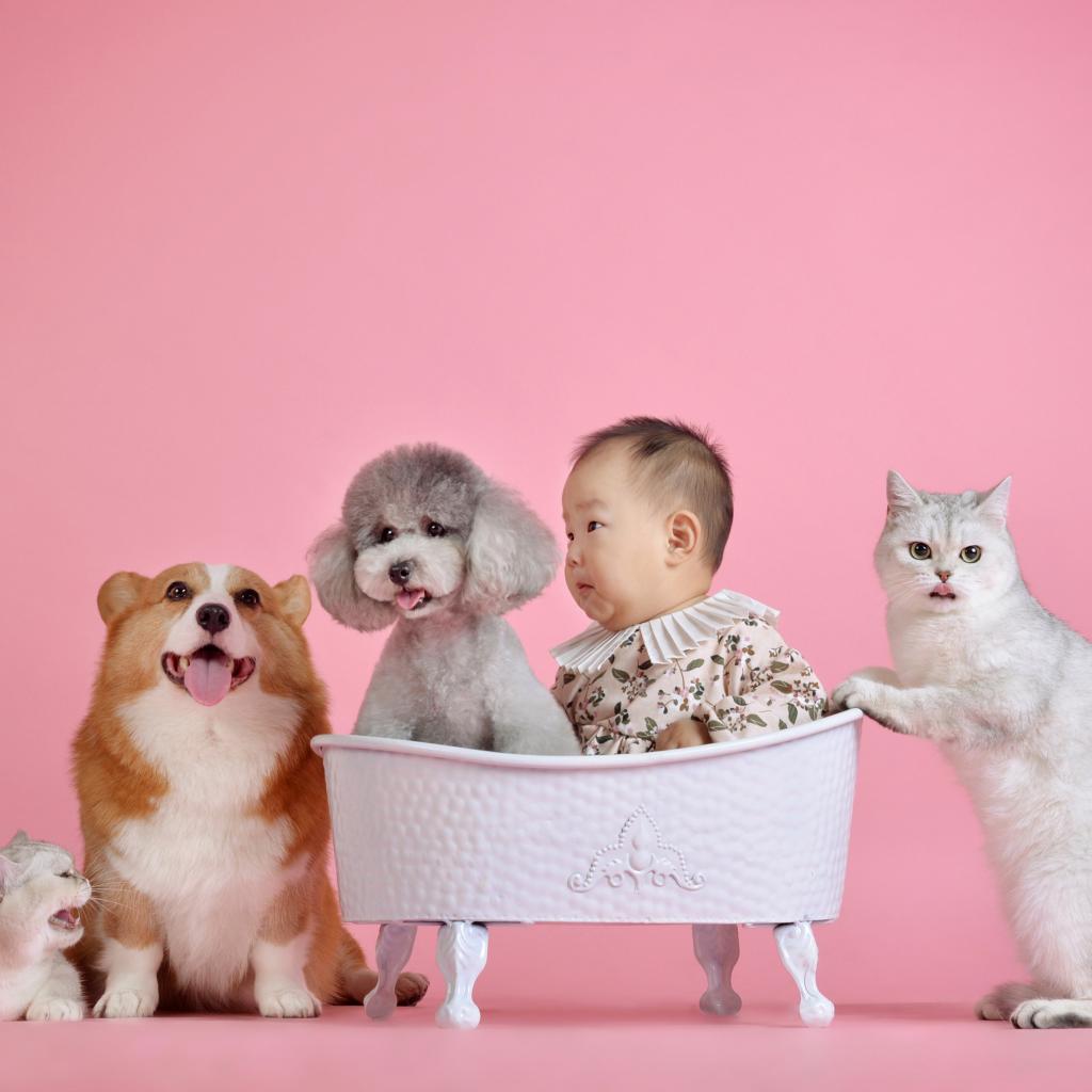 Обои Маленький ребенок азиат в корзине с собаками и кошками