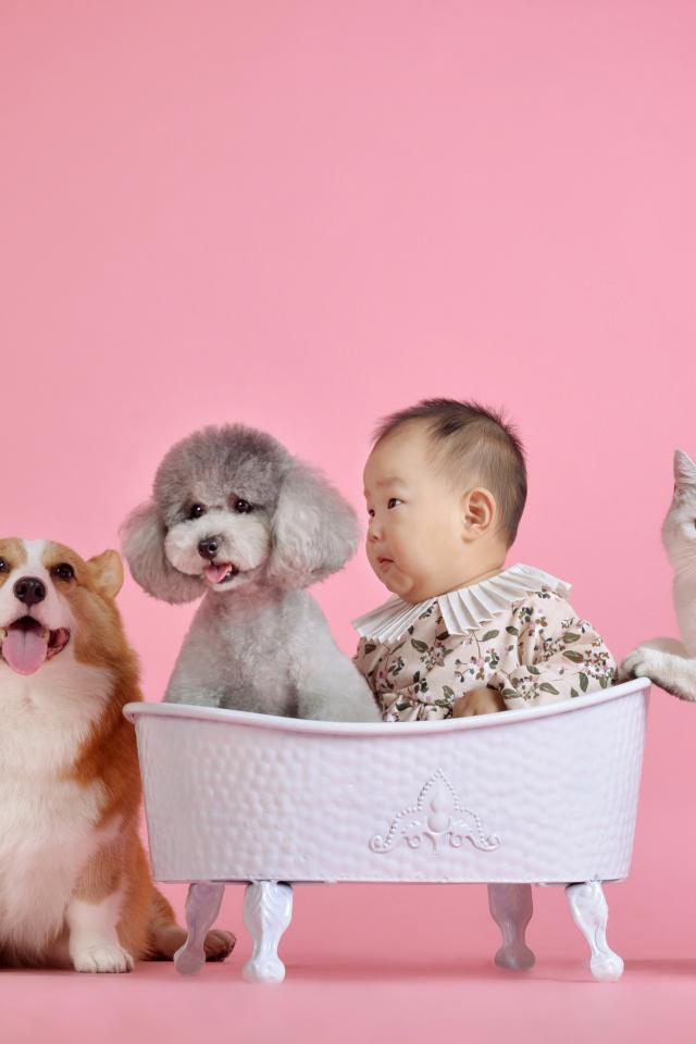Обои Маленький ребенок азиат в корзине с собаками и кошками