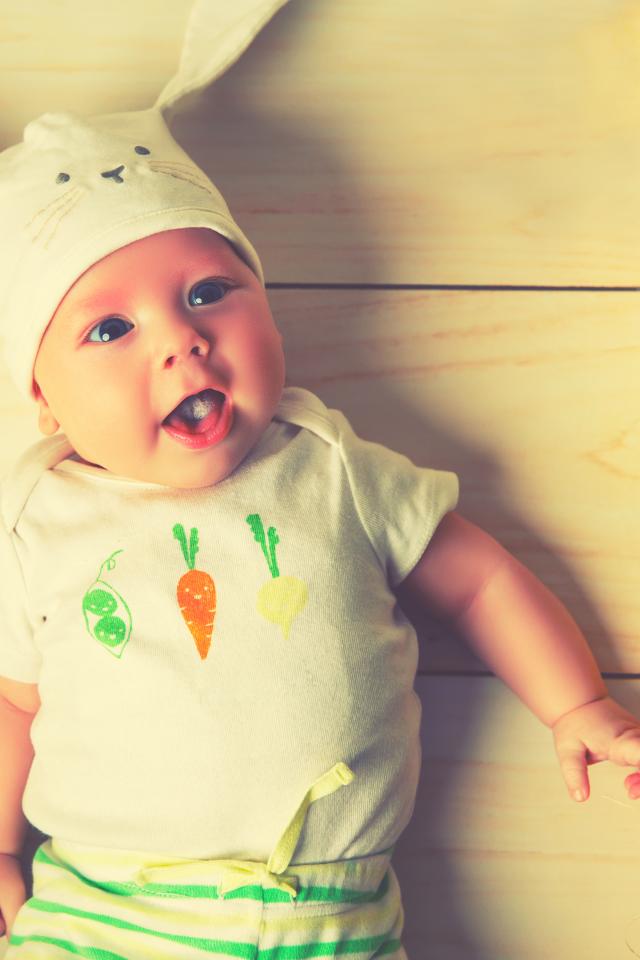 Обои Маленький улыбающийся грудной ребенок в костюме утенка