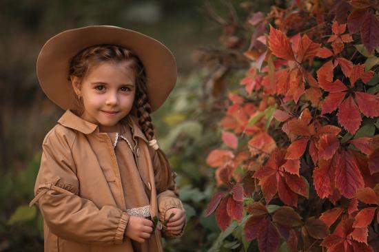 Обои Красивая девочка шляпе стоит у дикого винограда