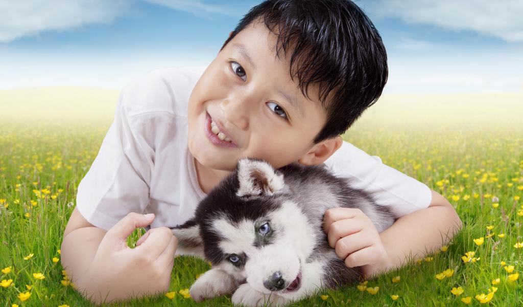 Обои Маленький мальчик с щенком хаски на зеленой траве