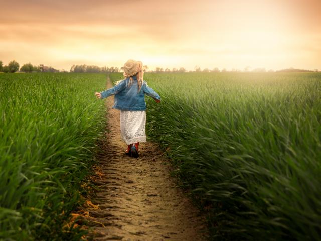 Обои Маленькая девочка идет по полю с зеленой травой