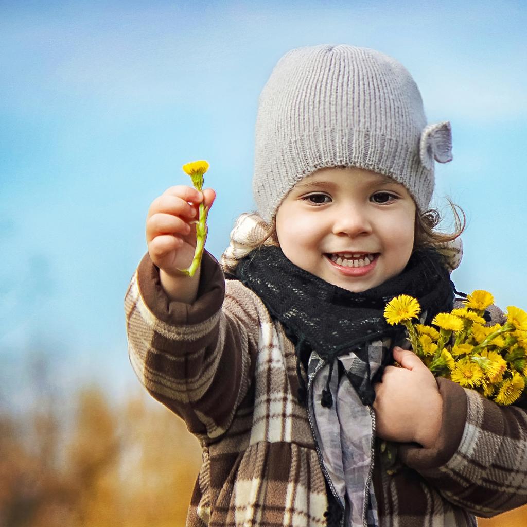 Обои Маленькая девочка в шапке с желтыми цветами в руке