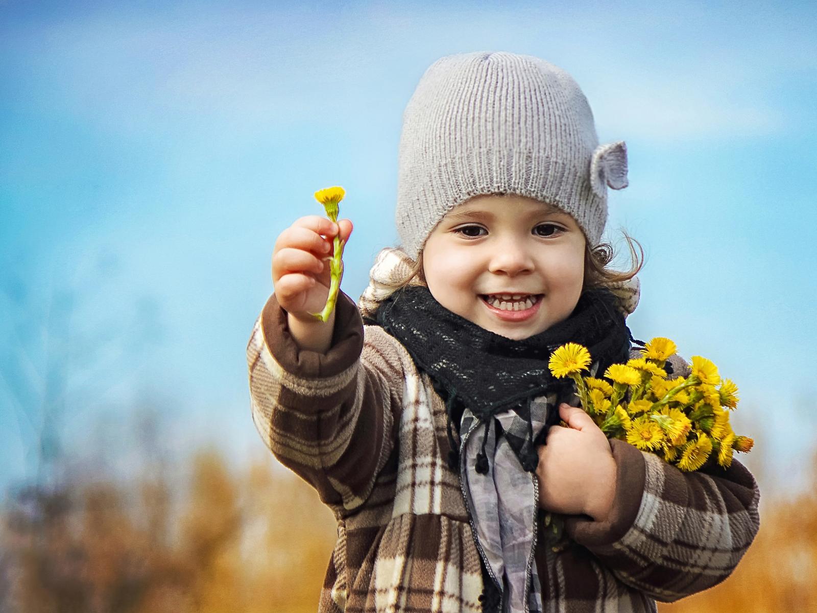 Обои Маленькая девочка в шапке с желтыми цветами в руке