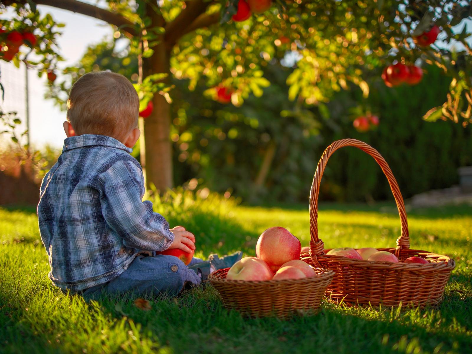 Обои Маленький мальчик с корзиной яблок сидит на зеленой траве