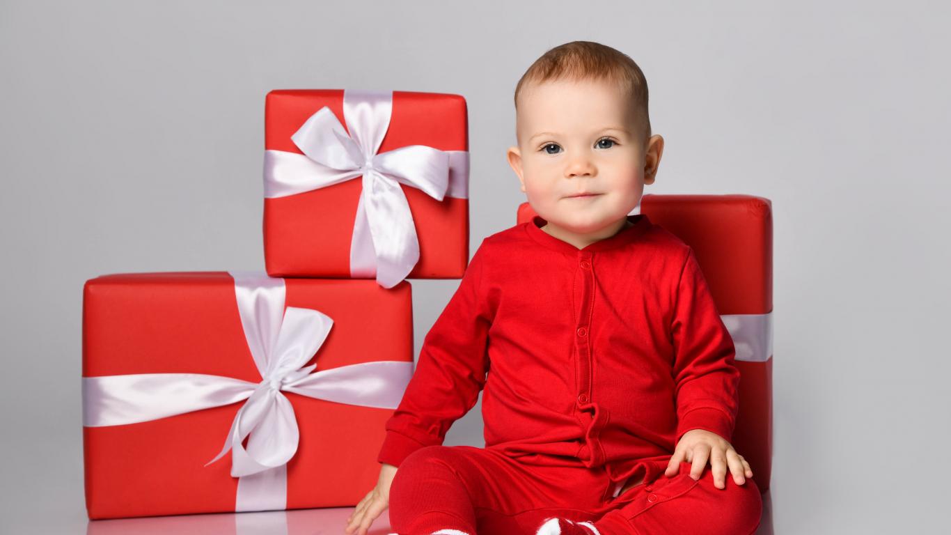 » Обои Милый малыш в красном костюме с подарками на новый год