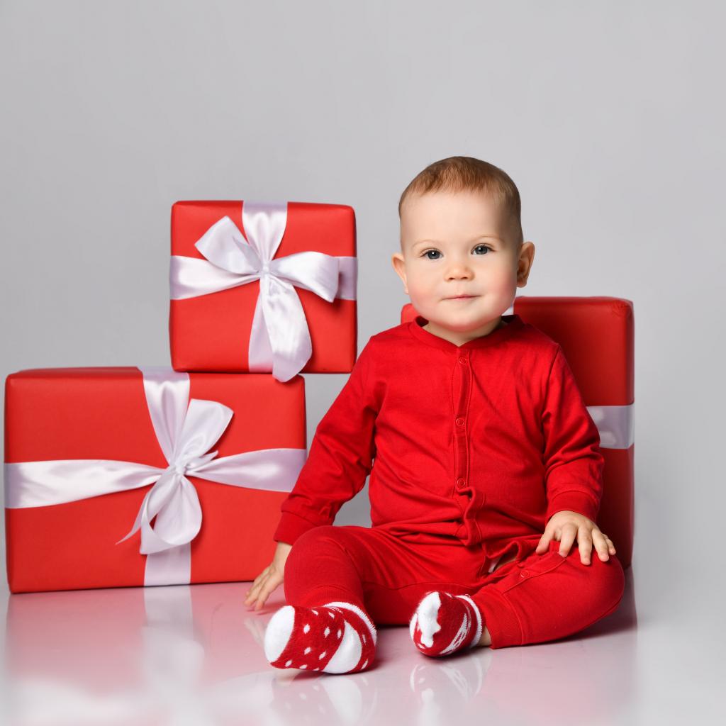 Обои Милый малыш в красном костюме с подарками на новый год