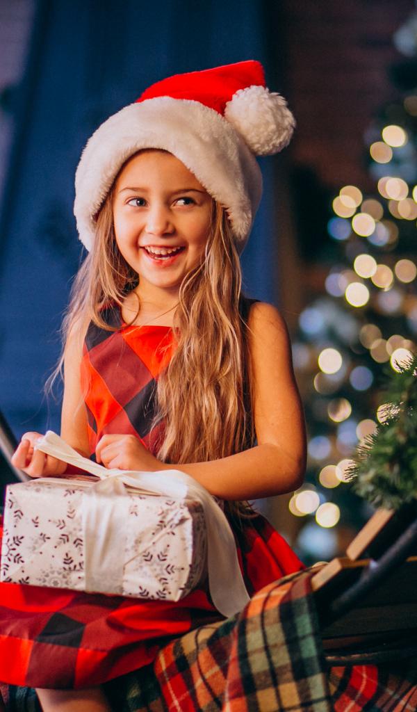 Обои Улыбающаяся девочка сидит с подарком на Рождество