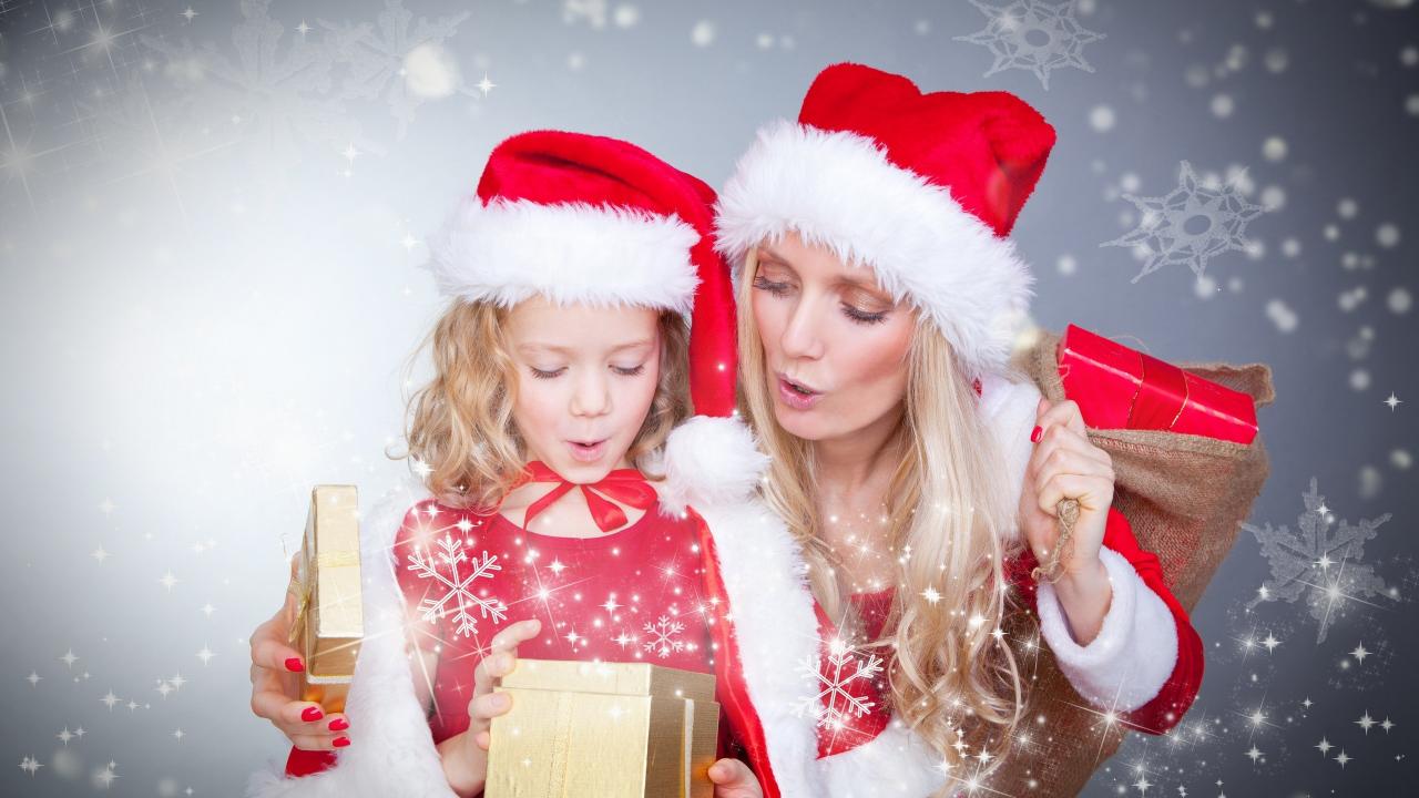 Обои Маленькая девочка с мамой в новогодних костюмах с подарками