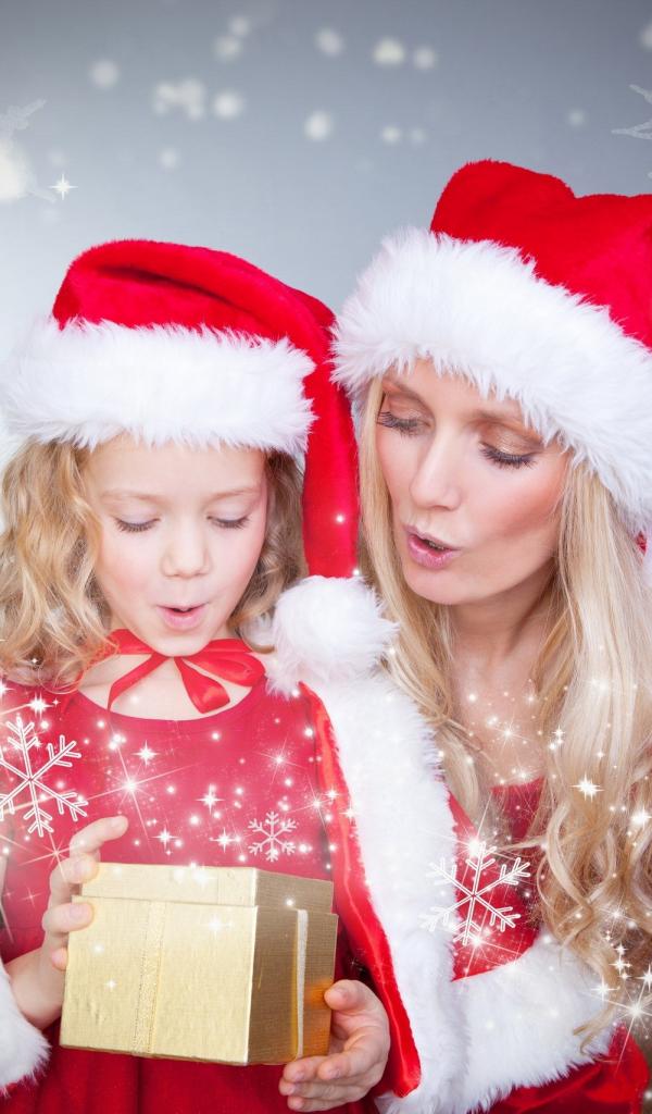 Обои Маленькая девочка с мамой в новогодних костюмах с подарками