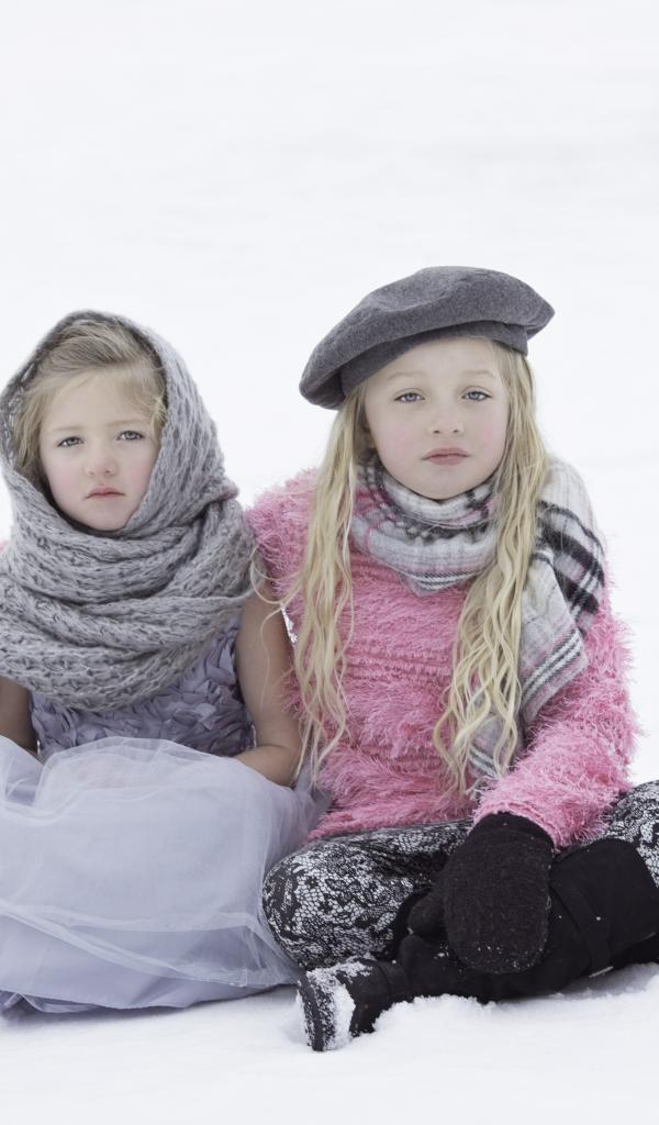 Обои Две маленьких сестры сидят на снегу