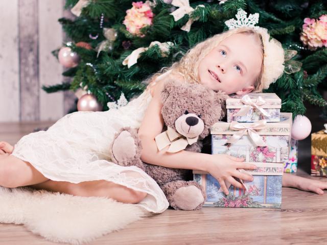 Обои Красивая голубоглазая девочка с подарками у елки