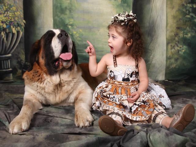 Обои Маленькая красивая девочка с собакой породы сенбернар