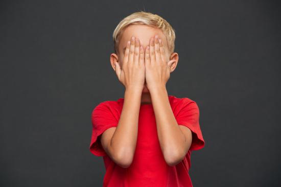 Обои Маленький мальчик в красной футболке закрыл лицо руками