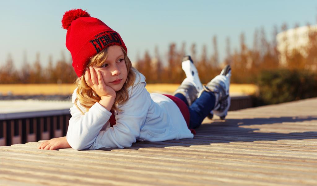 Обои Маленькая девочка на роликах лежит на мосту
