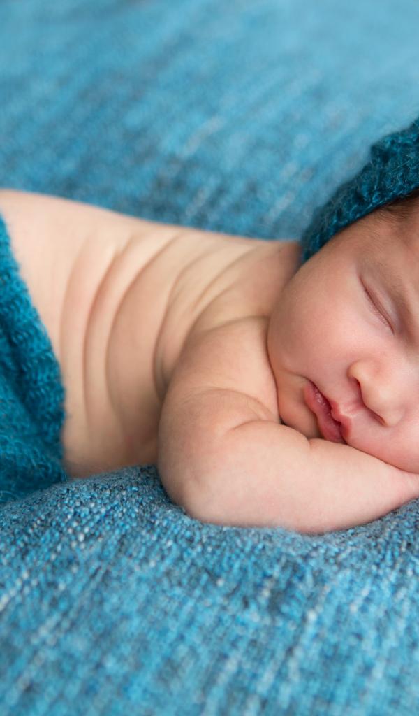Обои Спящий грудной ребенок лежит на голубом покрывале