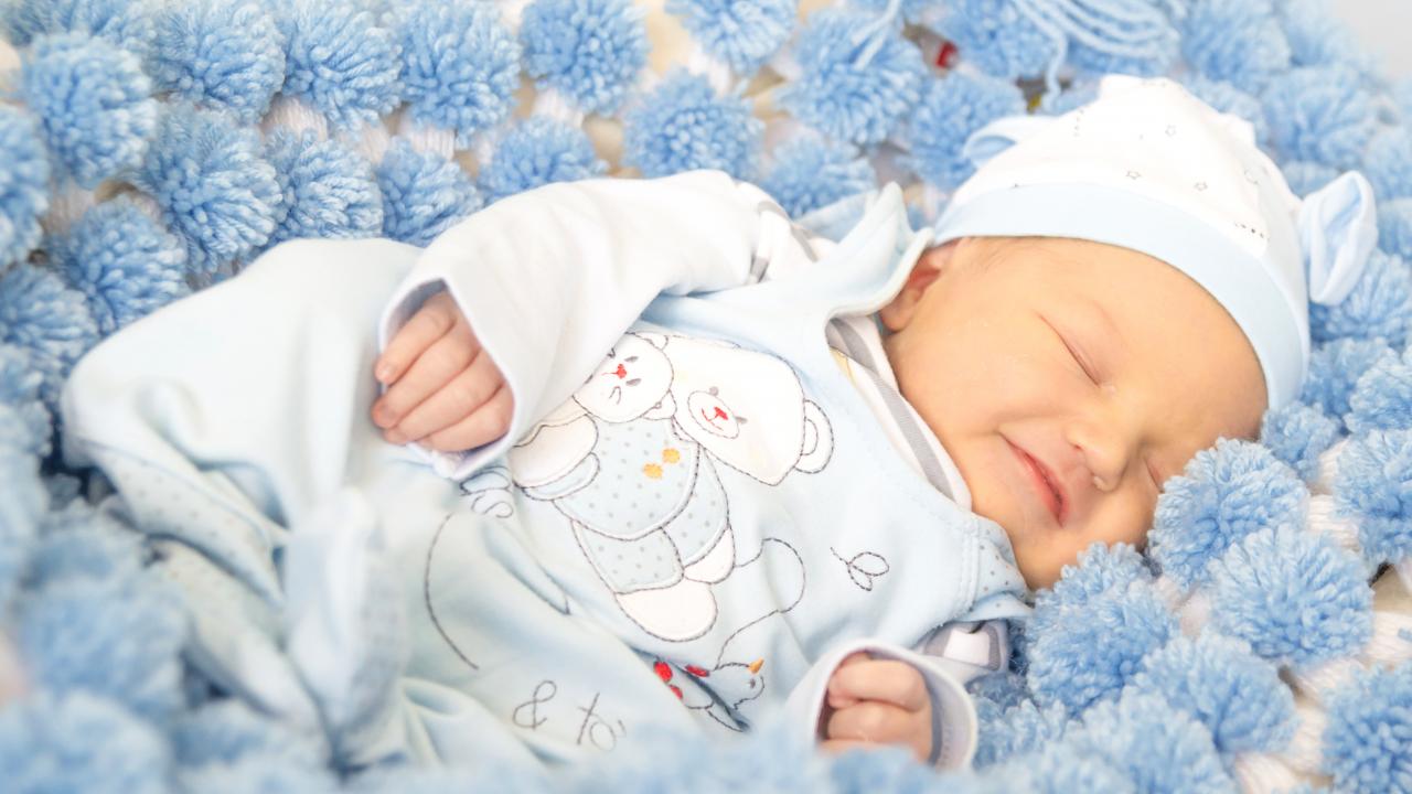 Обои Улыбающийся грудной ребенок спит на голубом покрывале