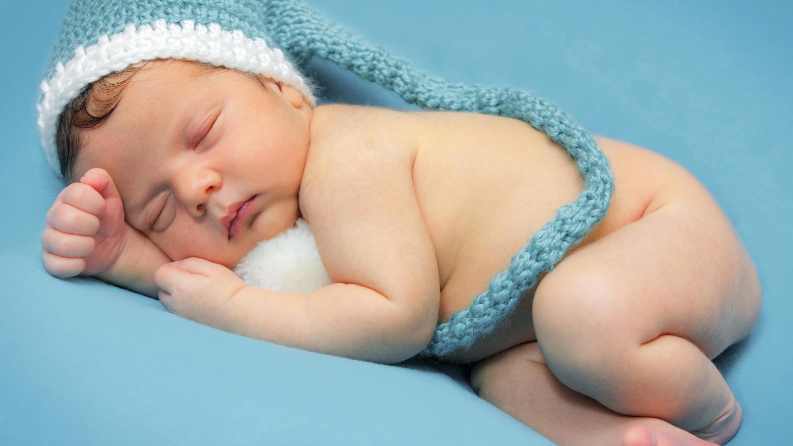 » Обои Маленький спящий ребенок в шапке на голубом фоне