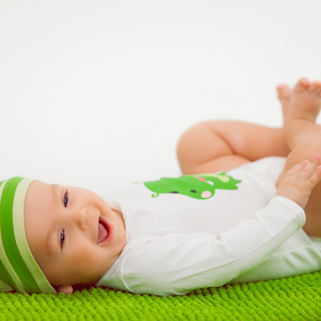 Обои Улыбающийся маленький ребенок лежит на зеленом покрывале