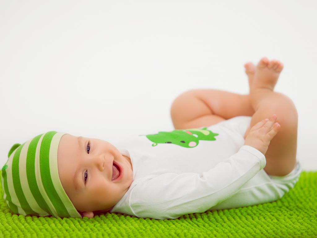 Обои Улыбающийся маленький ребенок лежит на зеленом покрывале