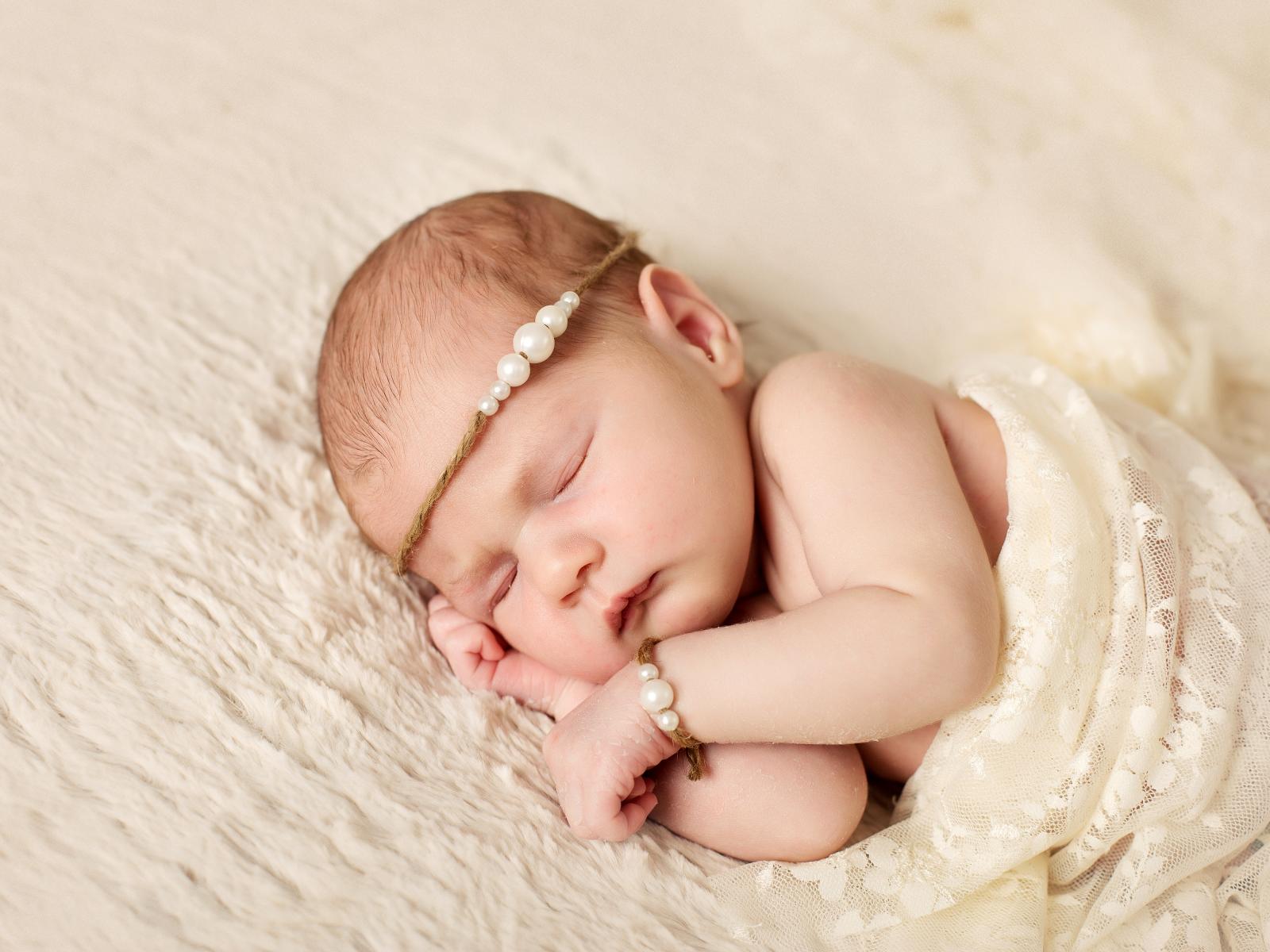 Обои Спящий грудной ребенок с украшением с жемчугом на голове