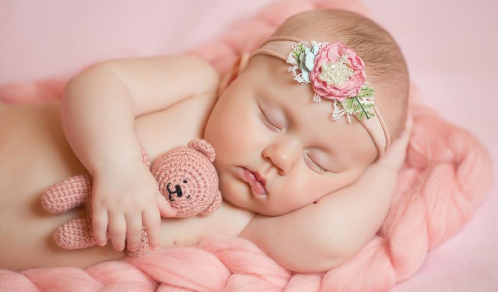 Обои Маленькая новорожденная девочка с вязаным мишкой