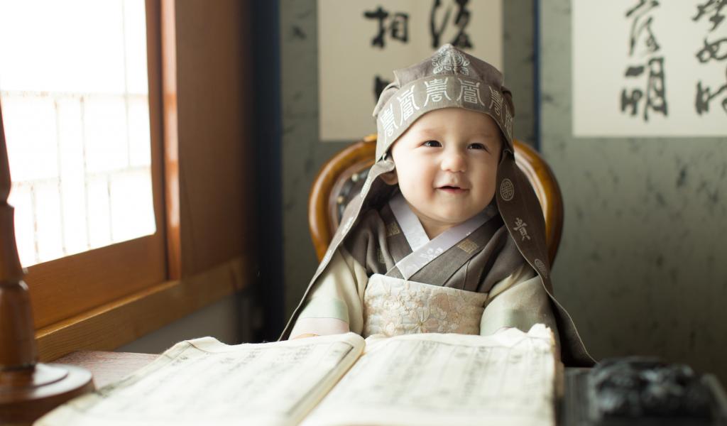 Обои Маленький азиатский мальчик за столом с книгой