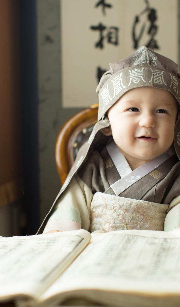 Обои Маленький азиатский мальчик за столом с книгой