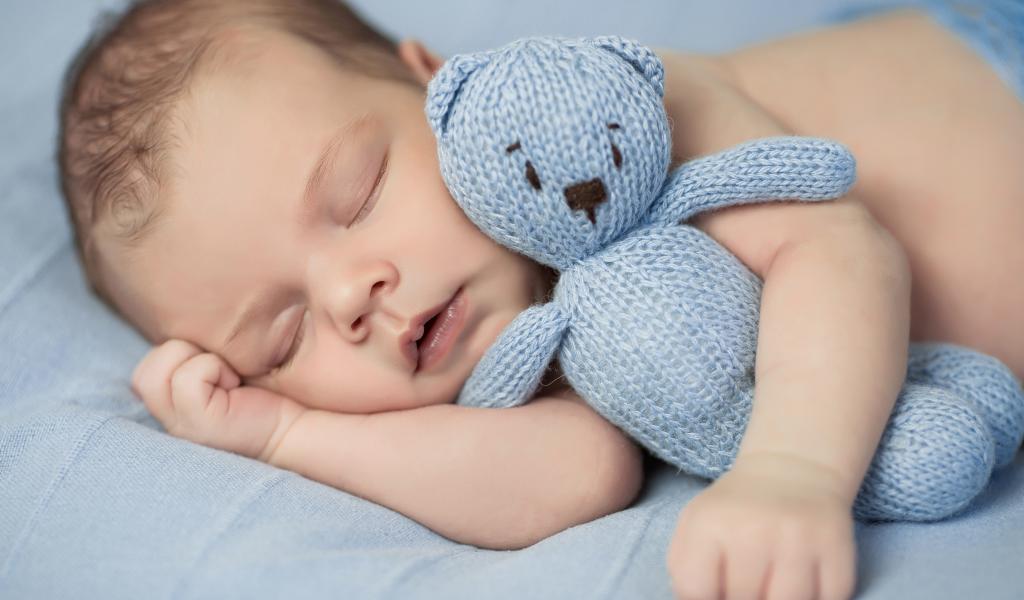 Обои Маленький грудной ребенок с вязаным мишкой