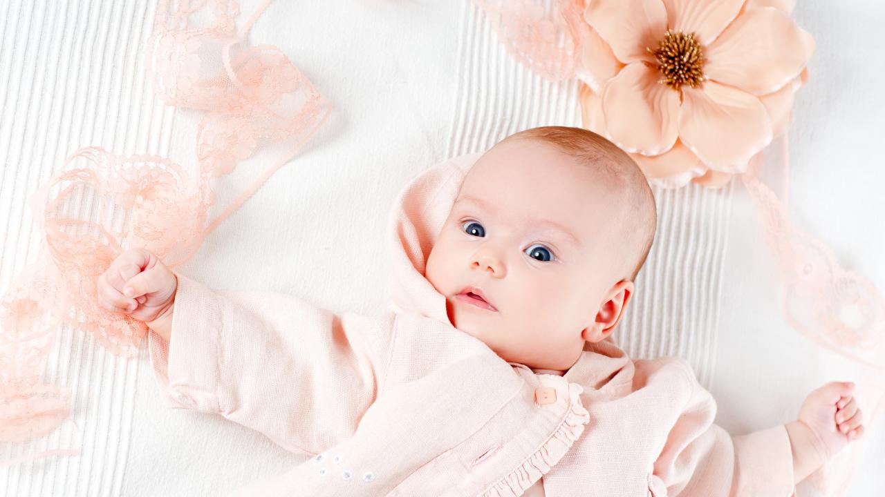 Обои Удивленный новорожденный ребенок с цветком