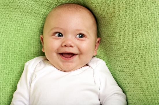 Обои Улыбающийся маленький ребенок на зеленом покрывале