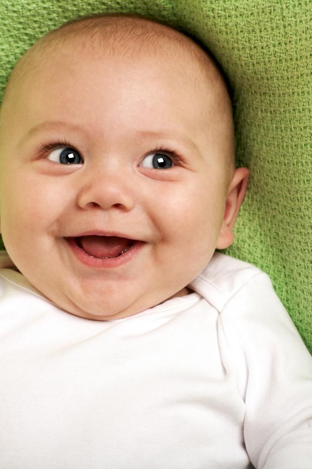 Обои Улыбающийся маленький ребенок на зеленом покрывале