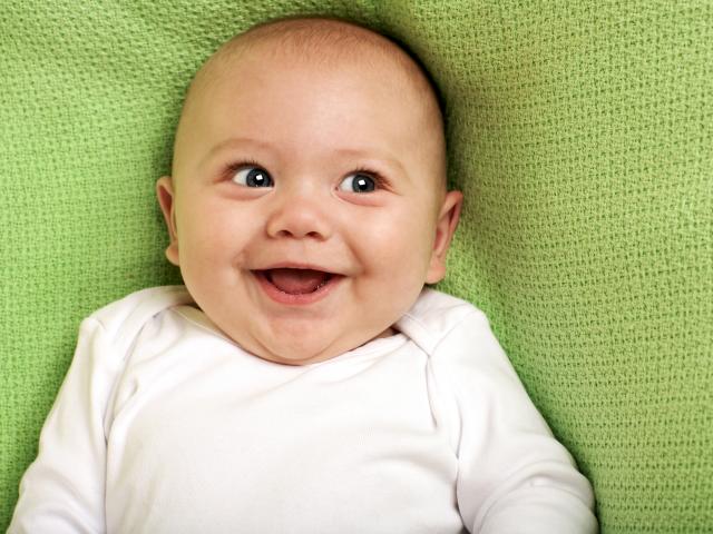 Обои Улыбающийся маленький ребенок на зеленом покрывале