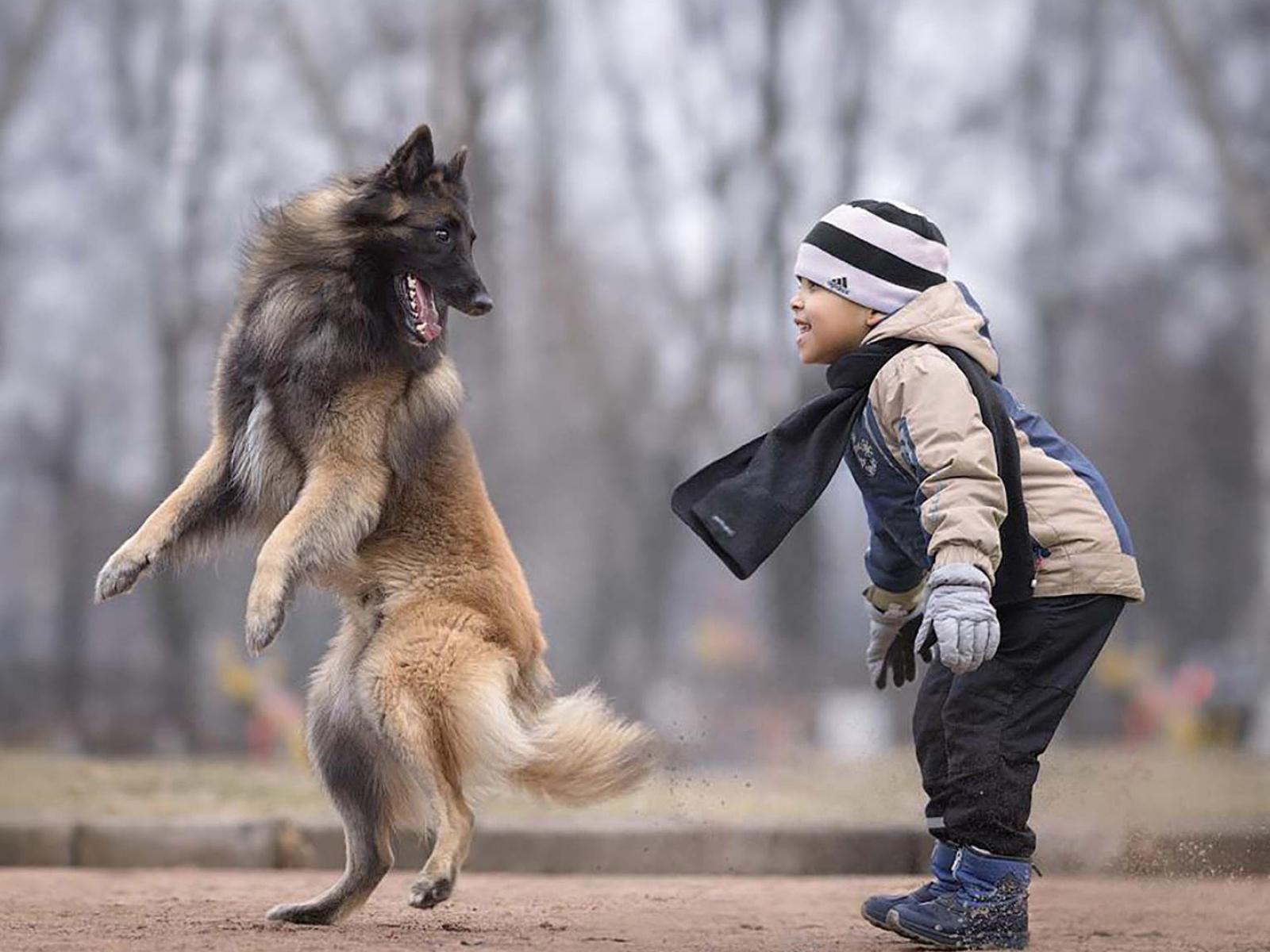 Обои Маленький мальчик играет с овчаркой