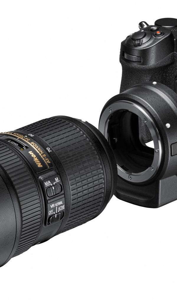 Обои Фотоаппарат Nikon Z7 с объективом на белом фоне