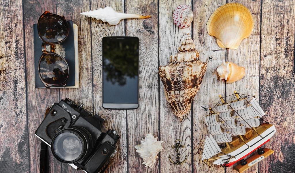 Обои Фотоаппарат, смартфон, ракушки, очки и паспорт на столе