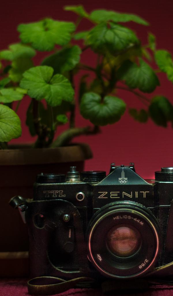 Обои Старый фотоаппарат zenit на столе с цветком герани