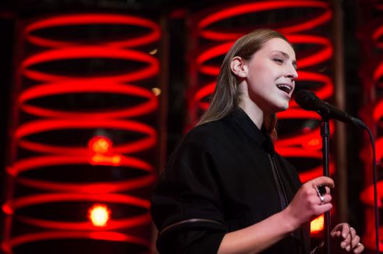 Обои Представительница Бельгии Сеннек с микрофоном, Евровидение 2018