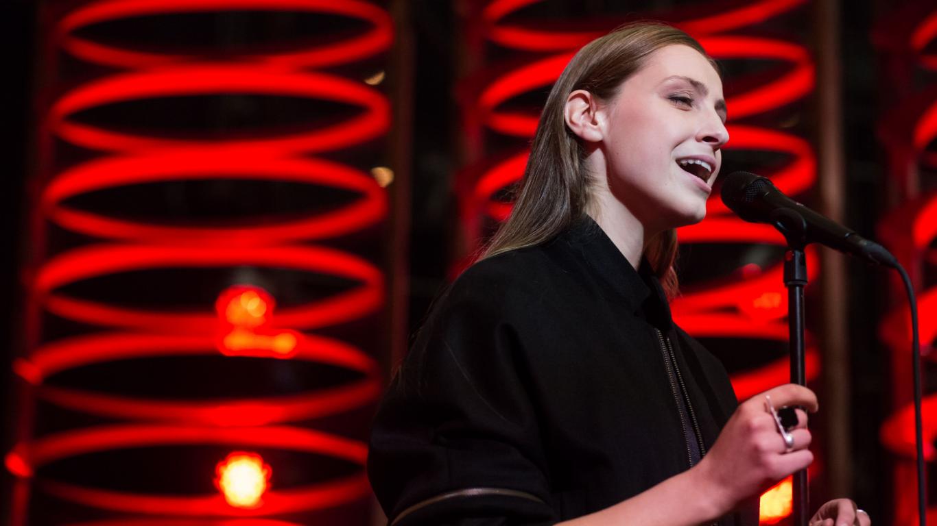 Обои Представительница Бельгии Сеннек с микрофоном, Евровидение 2018