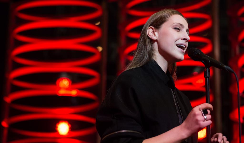 Обои Представительница Бельгии Сеннек с микрофоном, Евровидение 2018