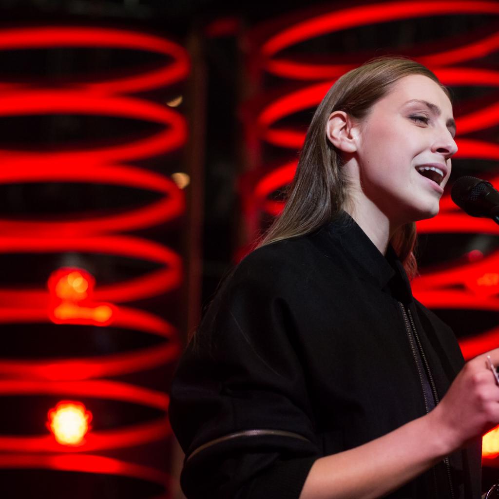 Обои Представительница Бельгии Сеннек с микрофоном, Евровидение 2018