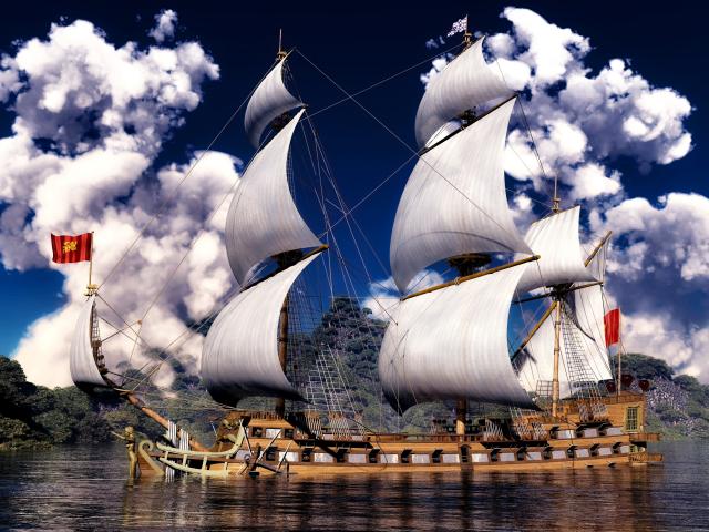 Обои Красивое парусное судно на фоне белых облаков